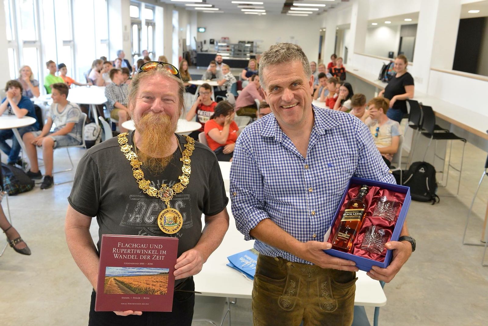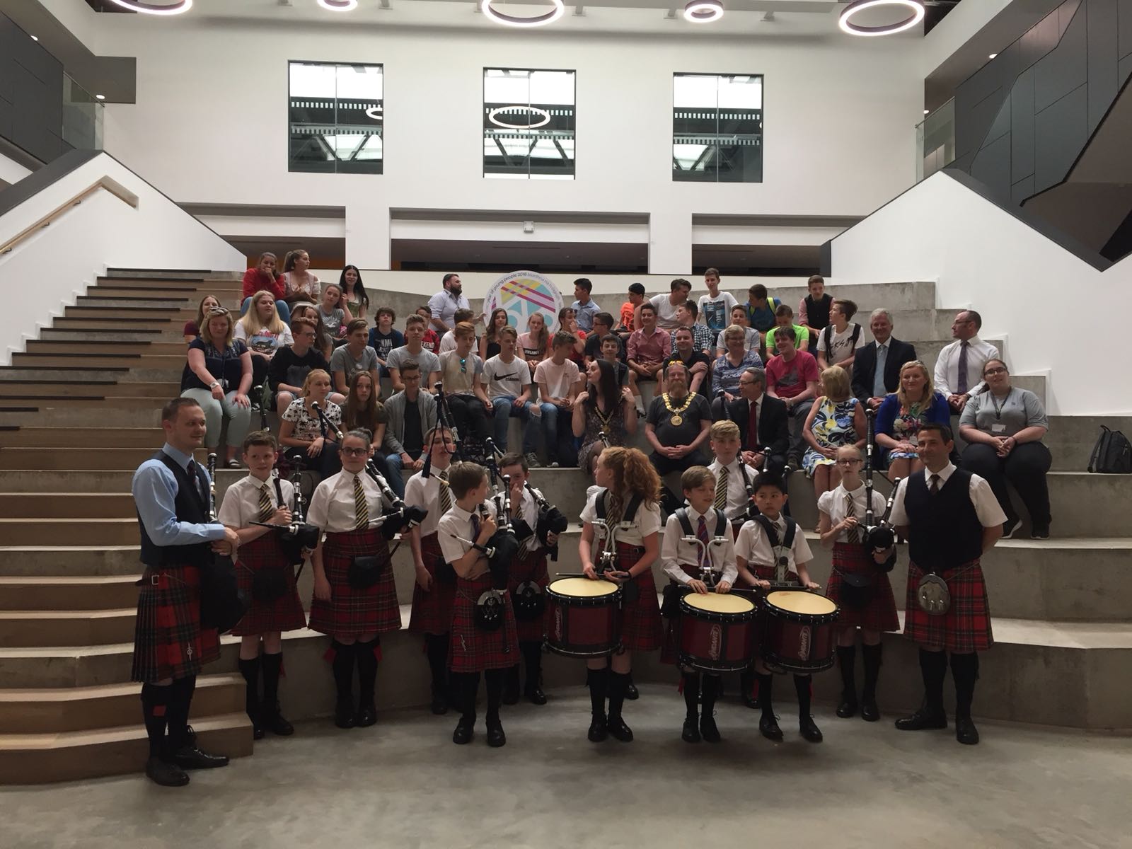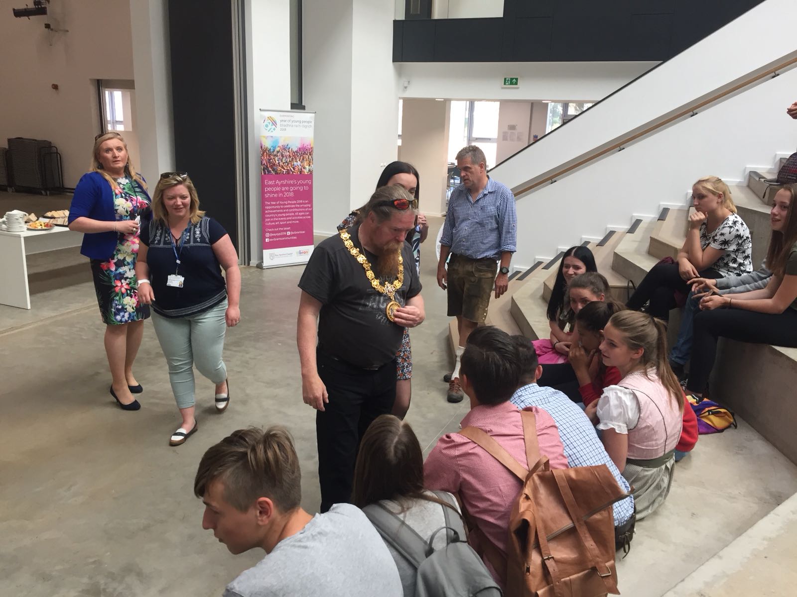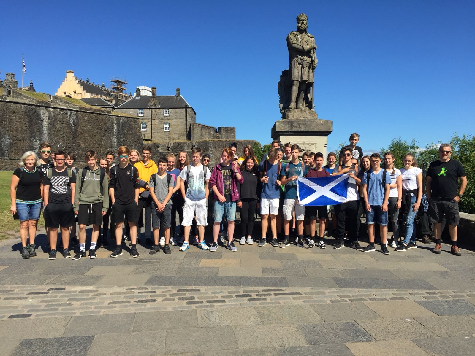 Bereits zum dritten Mal besuchten heuer 35 Schüler und drei Lehrer Schottland. Der Flug von München nach Edinburgh ist um zwei Stunden verspätet und das Gepäck lässt eine halbe Stunde auf sich warten. Schließlich kommen wir müde gegen drei Uhr morgens in unserer Unterkunft in Glasgow an. Am Morgen fährt die Gruppe nach Kilmarnock, einem kleinen Städtchen ca. eine halbe Autostunde südwestlich von Glasgow. Es gibt bereits seit einigen Jahren Kontakte der Pfadfinder zwischen Oberndorf und Kilmarnock. Mit einigen Jugendlichen sowie einigen Vertretern des East Ayrshire Councils fahren wir weiter nach Dumfries House, wo unsere Schüler mit den Jugendlichen aus Kilmarnock unter Anleitung von Trainern an teambuilding activities teilnehmen. Nach dem Mittagessen fahren wir nach Alloway, dem Geburtsort des berühmten schottischen Dichters Robert Burns. Zurück in Kilmarnock werden wir vom Provost Jim Todd, Depute Provost Claire Leitch sowie den Heads of Education und einigen Mitarbeitern des East Ayrshire Council‘s sehr herzlich im William McIllvanney Campus, einer kürzlich eröffneten Schule empfangen. Besonders die schuleigene Pipe Band hat uns mit ihren musikalischen Darbietungen sehr beeindruckt!